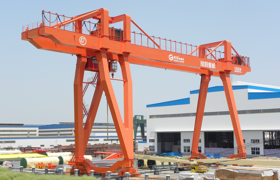 門式起重機(jī)是橋式起重機(jī)的一種變形,又叫龍門吊。主要用于室外的貨場(chǎng)、料場(chǎng)貨、散貨的裝卸作業(yè)。它的金屬結(jié)構(gòu)像門形框架,承載主梁下安裝兩條支腳,可以直接在地面的軌道上行走,主梁兩端可以具有外伸懸臂梁。門式起重機(jī)具有場(chǎng)地利用率高、作業(yè)范圍大、適應(yīng)面廣、通用性強(qiáng)等特點(diǎn),在港口貨場(chǎng)得到廣泛使用。