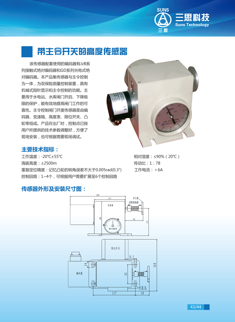 該傳感器配套使用的編碼器有JzB系列接觸式絕對(duì)編碼器和GD系列光電式絕對(duì)編碼器。本產(chǎn)品集傳感器與主令控制為一體,為雙保險(xiǎn)測(cè)量控制裝置,具有機(jī)械式指針顯示和主令控制的功能。主要用于水電站、水庫(kù)閘門開啟、下降極限的保護(hù),能有效地提高閘門工作的可靠性。主令控制閘門開度傳感器是由編碼器、變速箱、高度表、限位開關(guān)、凸輪等組成。產(chǎn)品在出廠時(shí),控制點(diǎn)已按用戶所提供的技術(shù)參數(shù)調(diào)整好,方便了現(xiàn)場(chǎng)安裝,也可根據(jù)需要現(xiàn)場(chǎng)調(diào)試。