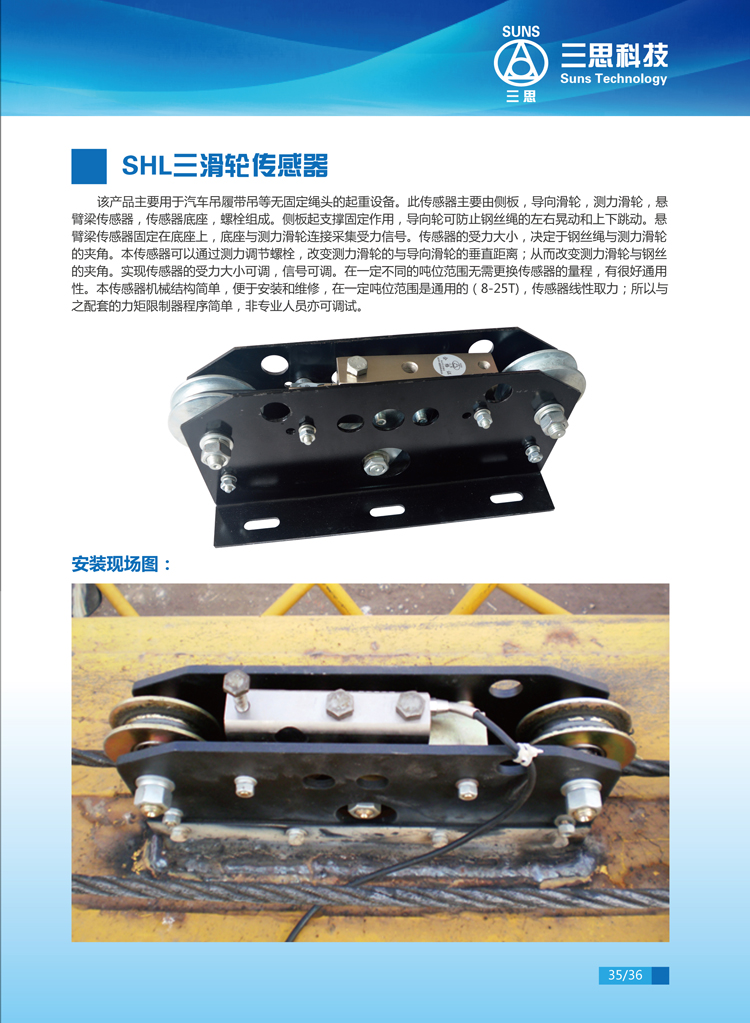 該產(chǎn)品主要用于汽車吊、履帶吊等無固定繩頭的起重設備。此傳感器主要由側(cè)板、導向滑輪、測力滑輪、懸臂粱傳感器、傳感器底座 ,螺栓組成。側(cè)板起支撐固定作用,導向輪可防止鋼絲繩的左右晃動和上下跳動。懸臂粱傳感器固定在底座上,底座與測力滑輪連接采集受力信號。傳感器的受力大小,決定于鋼絲繩與測力滑輪的夾角。本傳感器可以通過測力調(diào)節(jié)螺栓,改變測力滑輪的與導向滑輪的垂直距離,從而改變測力滑輪與鋼絲的夾角,實現(xiàn)傳感器的受力大小可調(diào)、信號可調(diào)。在一定不同的噸位范圍無需更換傳感器的量程,有很好通用性。本傳感器機械結構簡單 ,便于安裝和維修,在一定噸位范圍是通用的(8-25T),傳感器線性取力,所以與之配套的力矩限制器程序簡單,非專業(yè)人員亦可調(diào)試。