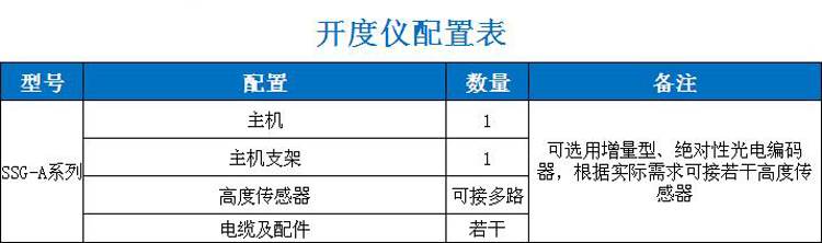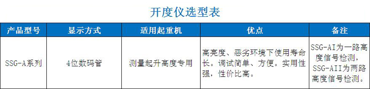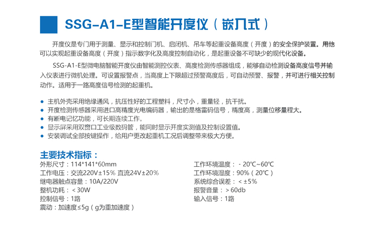 產(chǎn)品詳情 功能介紹 產(chǎn)品優(yōu)勢 產(chǎn)品參數(shù) 包裝清單 產(chǎn)品詳情 SSG-AⅠ-E型微電腦智能開度儀由智能測控儀表、高度檢測傳感器組成,能夠自動檢測設(shè)備高度信號并輸入儀表進行微機處理??稍O(shè)置報警點,當(dāng)高度上下限超過預(yù)警高度后,可自動預(yù)警、報警,并可進行相關(guān)控制動作。適用于一路高度信號檢測的起重機。 功能介紹 產(chǎn)品優(yōu)勢 產(chǎn)品參數(shù) 包裝清單