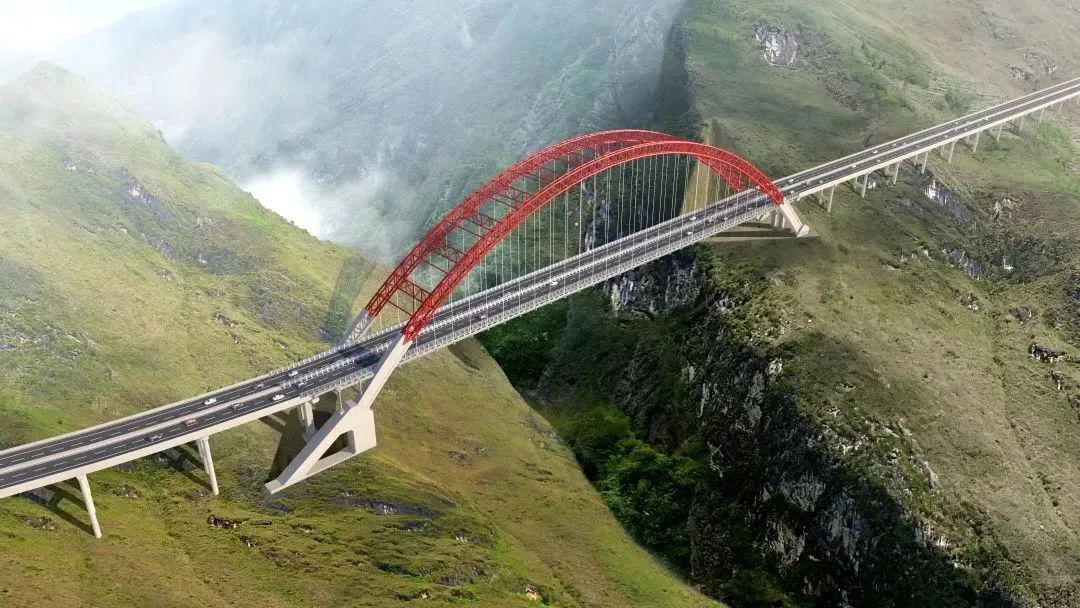 上烏角特大橋位于四川省涼山彝族自治州雷波縣境內(nèi),為鋼管混凝土中承式拱橋。上烏角特大橋主橋為332.5m的中承式鋼管混凝土拱橋,拱圈首創(chuàng)采用左右不對稱高低拱設計,左側(cè)拱肋凈跨徑310m,右側(cè)拱肋凈跨徑306m,分別由4根φ800mm的鋼管混凝土弦管組成,內(nèi)灌C60混凝土。大橋纜索吊裝系統(tǒng)跨徑組合布置為203m+395.5m+297m,最高塔高155m,設計吊重為90t。